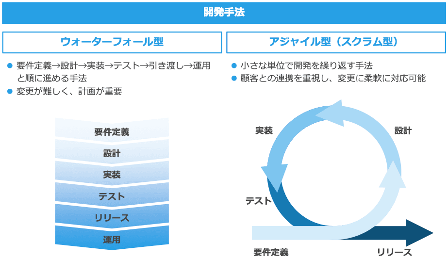 また、これらの作業フローの進め方にもいくつか種類があります。ここでは特に開発の現場で用いられている2つの手法について解説します。