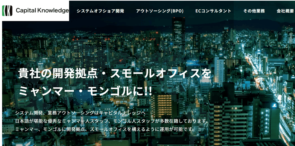 株式会社キャピタルナレッジは、ミャンマーとモンゴルの優秀なエンジニアを活用したオフショア開発で、スピード・クオリティ・コストの最適化を実現しています。システム開発から各種のビジネスプロセスの代行までを、日本国内と同じクオリティかつ低コストで提供可能です。