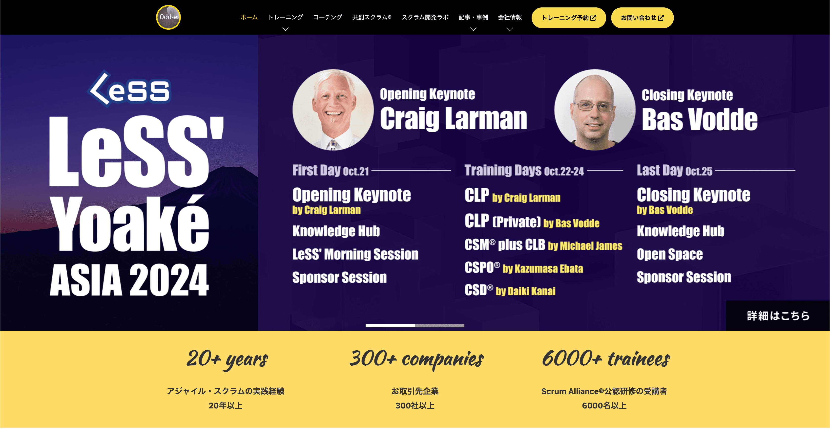 株式会社Odd-e Japanは、アジャイル開発およびスクラムの導入と教育に特化し、20年以上にわたって日本国内外で企業の変革支援を行っています。同社は「共創スクラム®」を通じて、クライアントと密接に連携したプロダクト開発を提供するほか、スクラムトレーニングやアジャイルコーチングなどを提供し、スクラムマスターやプロダクトオーナーの育成を行っています。