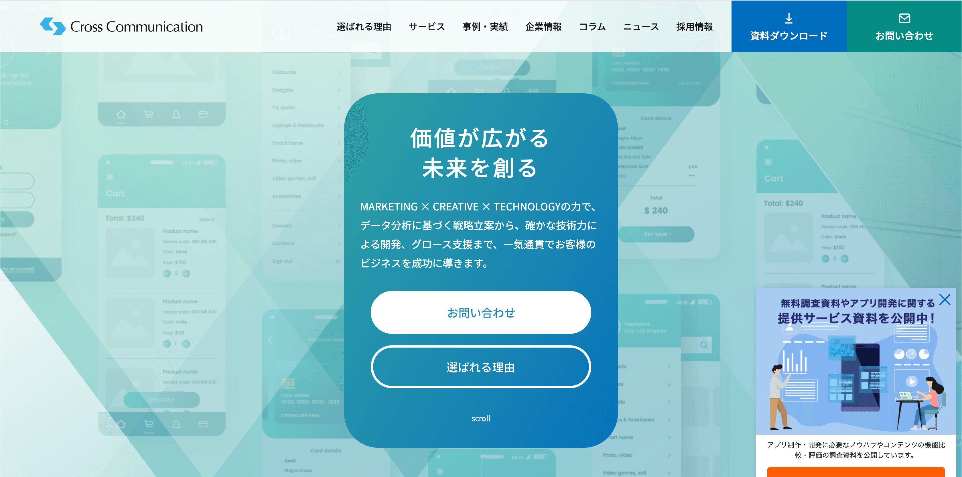 クロス・コミュニケーションはデータ分析に基づいた戦略立案から開発、グロース支援に至るまで、一気通貫のサービスを展開しています。特にアプリ開発、ウェブ開発、LINE活用などのデジタルトランスフォーメーション(DX)を推進するための技術とサービスに焦点を当てており、金融業向けアプリプラットフォームやインフラ設計・構築、UI/UXデザインの分野でも活動しています。
